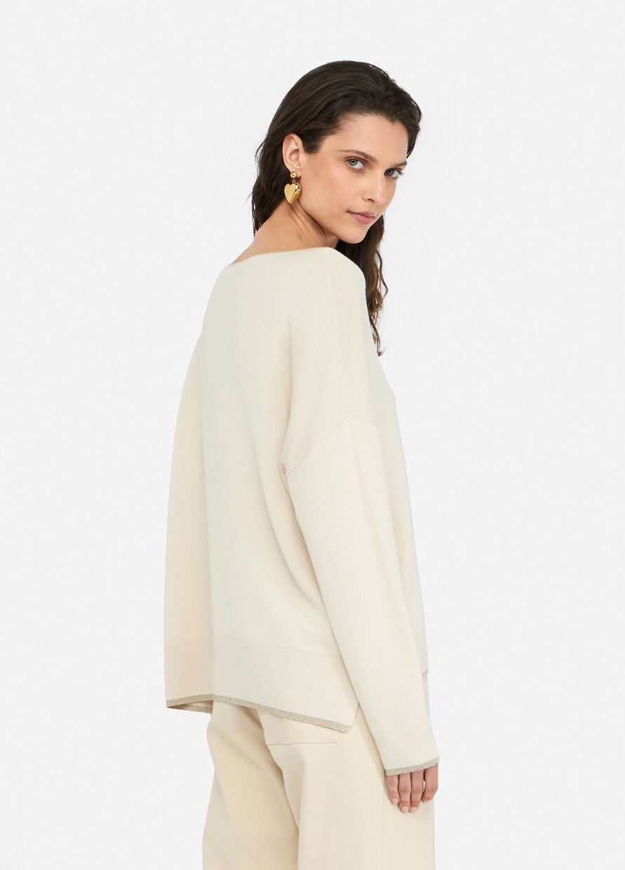 Questa maglia girocollo in viscosa panna è un capo essenziale per ogni guardaroba. Con il suo design classico e il dettaglio di riporto in lurex, questa maglia dona un tocco di eleganza a qualsiasi outfit. Perfetta per il lavoro o il tempo libero, this maglia è un must-have per ogni donna moderna.