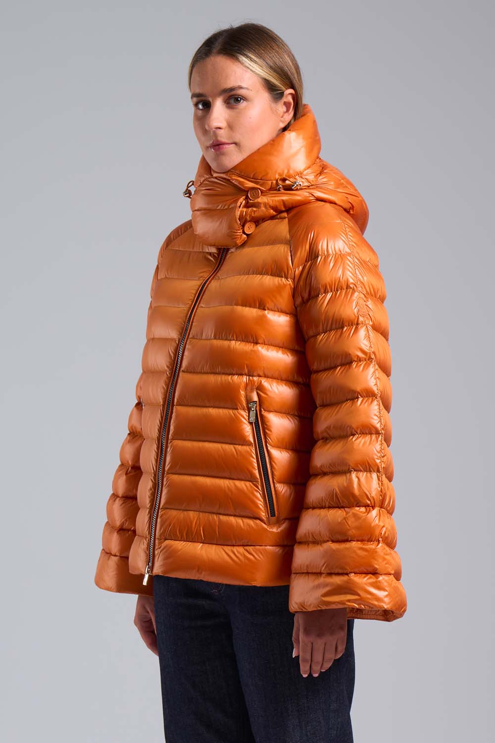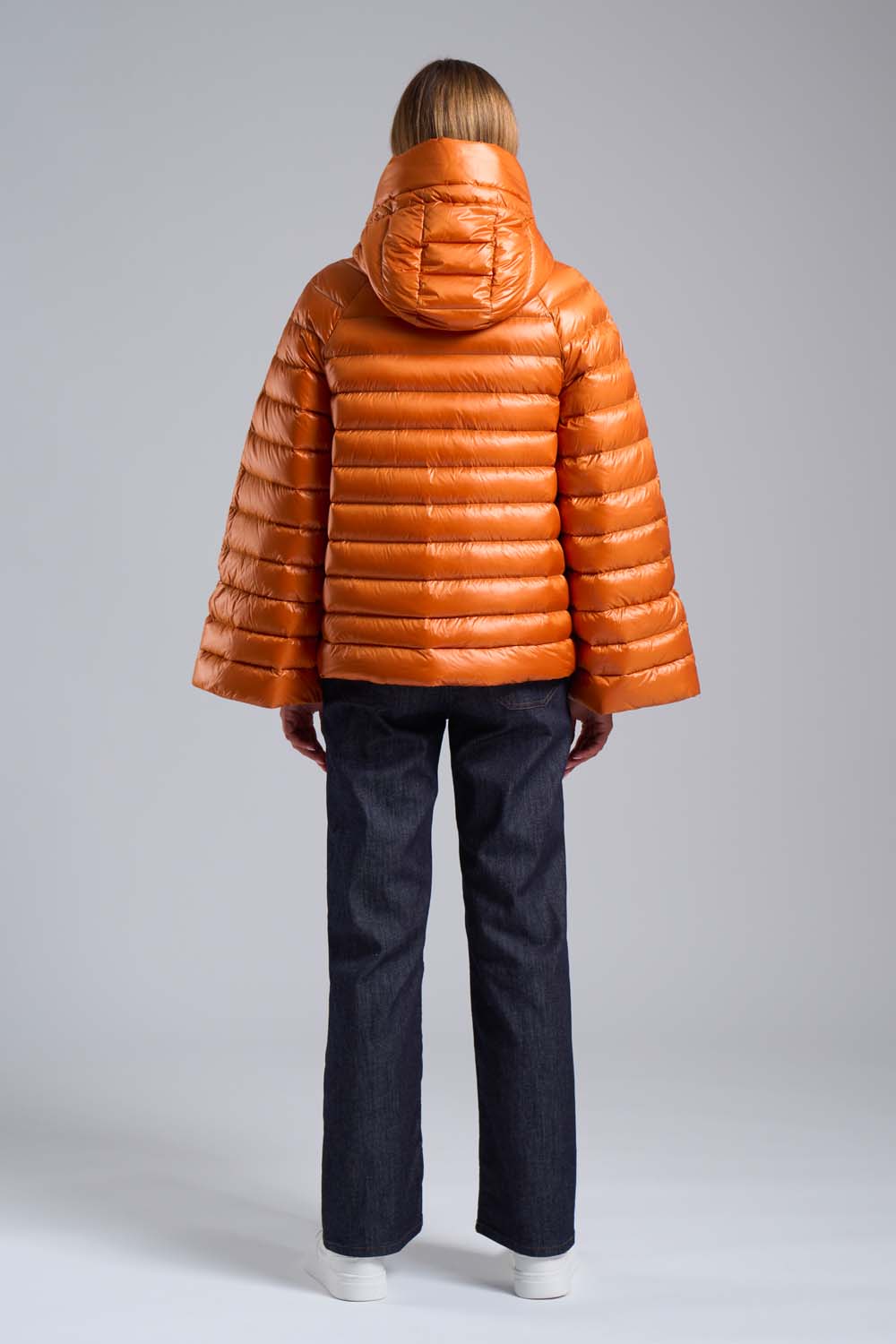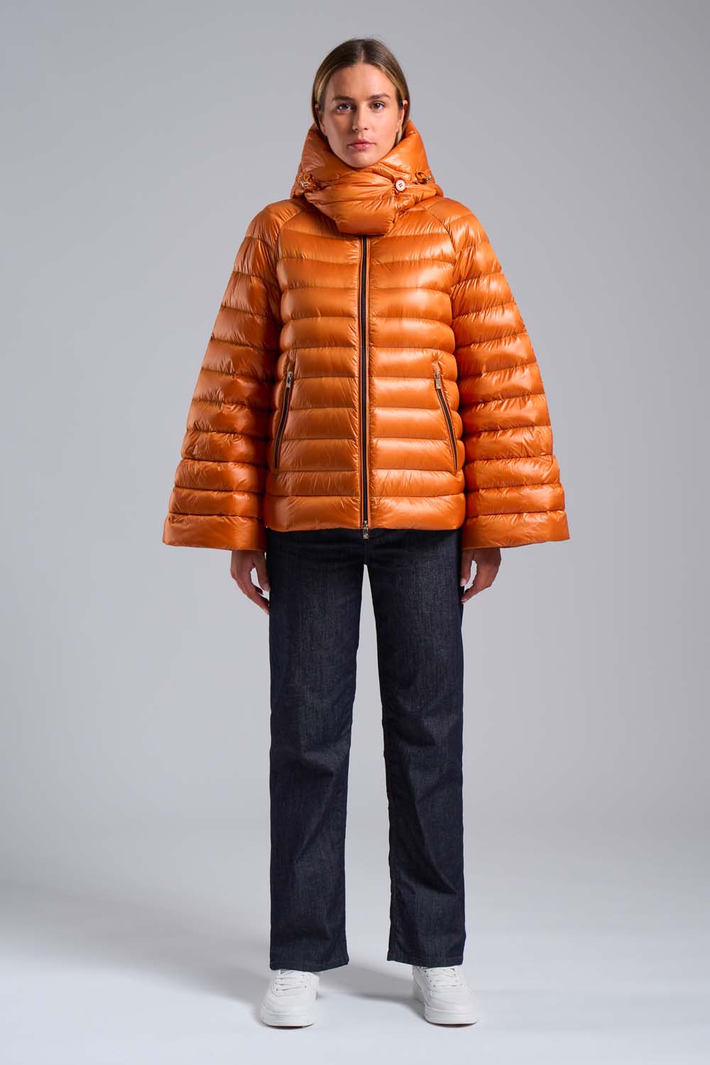 Piumino da donna in colore ocra dalla linea svasata con manica a campana e cappuccio staccabile, realizzato in vera piuma.