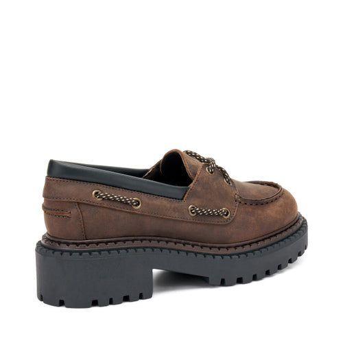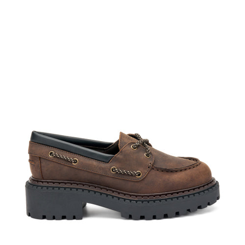 Mocassino da barca rivisitato in chiave bold, realizzato in pelle effetto vissuto. I dettagli ispirati al mondo marittimo e le cuciture a vista uniscono lo spirito heritage a un’estetica contemporanea. La suola carrarmato con doppio guardolo dona grinta e carattere a ogni passo.