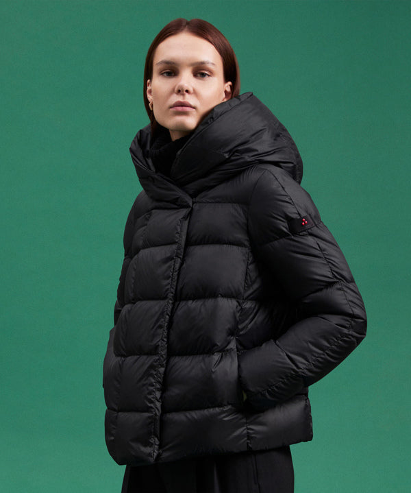 Piumino comodo in tessuto superleggero, semi opaco e compatto, realizzato in 100% poliestere riciclato post consumo. Idrorepellente con trattamento PFC Free che non impiega sostanze nocive per l’ambiente. La varietà dei dettagli fa di questo capo un must-have del guardaroba femminile di questa stagione: full zip centrale e bottoni a pressione nascosti da patta, tasche laterali a scomparsa con bottone singolo a pressione, ampio collo a scialle che avvolge dolcemente proteggendo dalle intemperie e cappuccio fisso. Un capo riconoscibile per il perfetto mix tra estetica, praticità e stile urban, adatto a chi vive con dinamicità, spaziando tra occasioni mondane e momenti informali.
