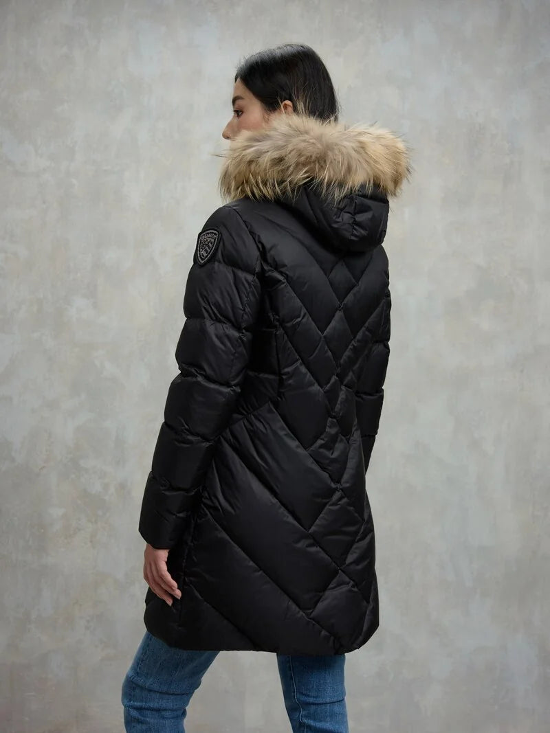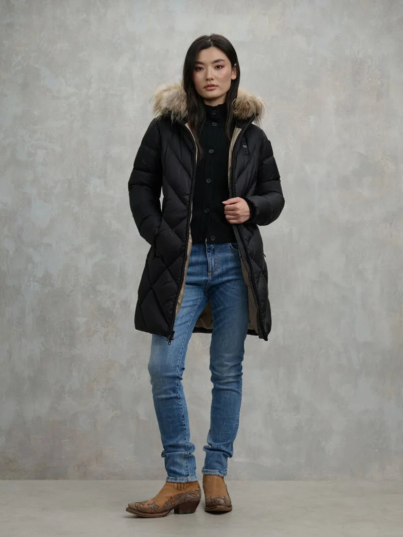 Piumino lungo idrorepellente trapuntato a linee geometriche. Piumino sfiancato per donare risalto al punto vita.