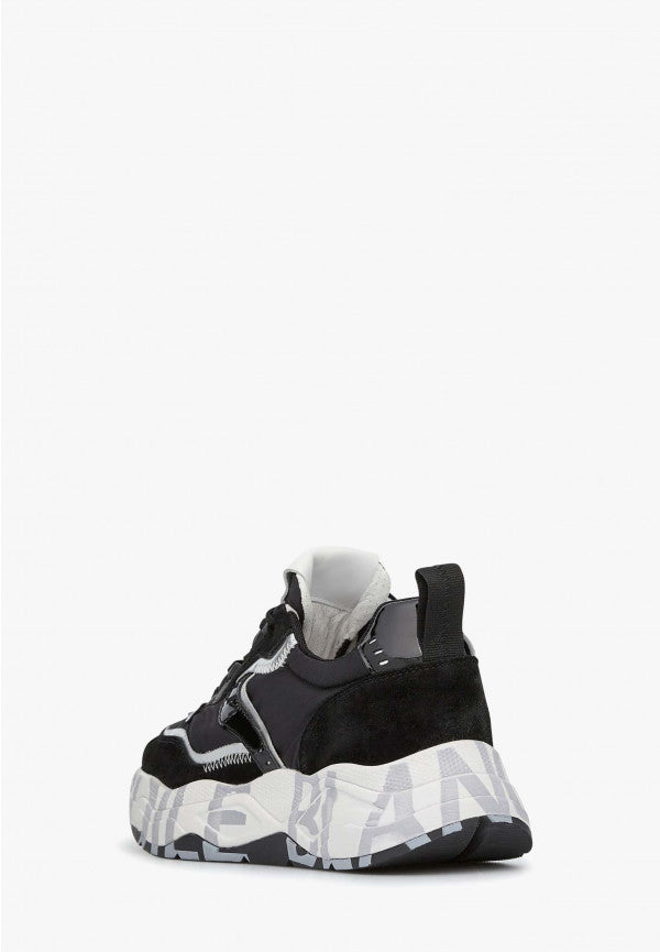 Sneaker in tessuto tecnico e suede con impunture a contrasto, dettagli in vernice e profili argentati. Suola a doppia altezza con stampa serigrafica laterale.