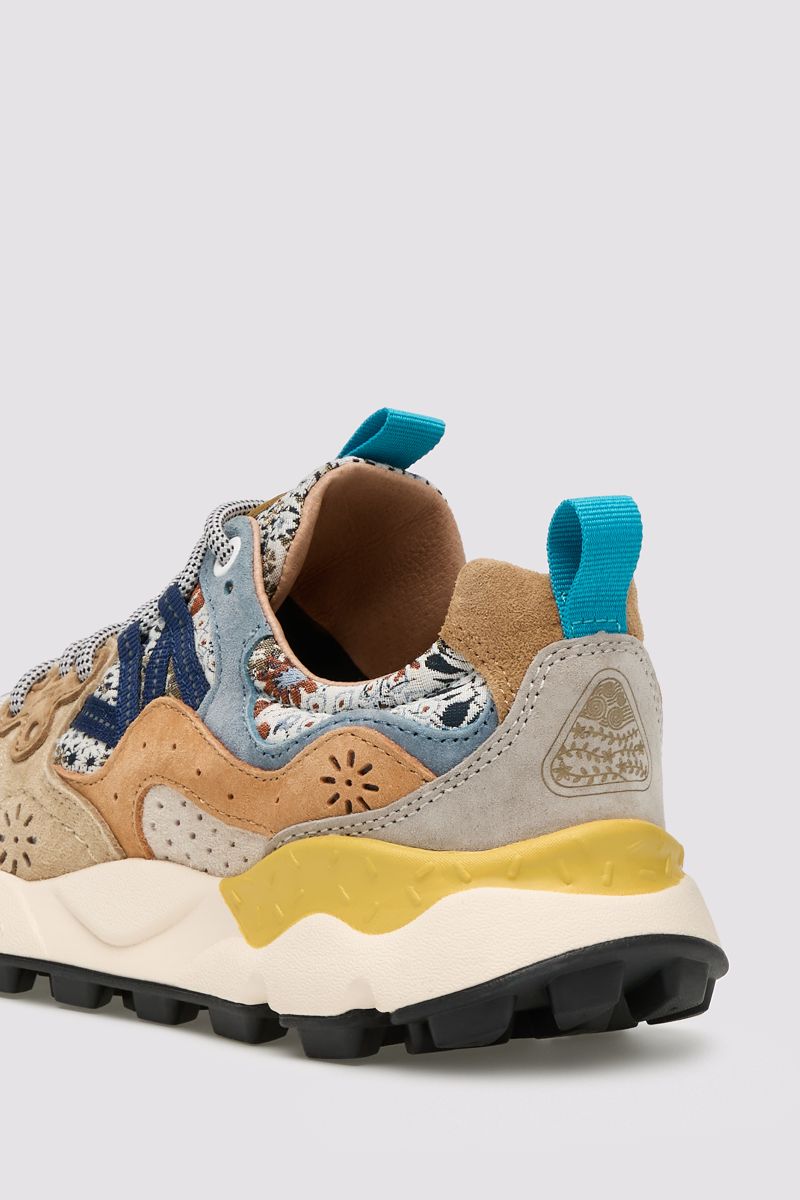 Sneaker in tessuto canvas con fantasia floreale e dettagli in suede. Chiusura con stringhe trekking bicolore e occhielli personalizzati. Piccoli loop in nastro tecnico su linguetta e toppone. Fodera in tessuto e pelle, con soletta interna in sughero naturale antibatterico. Fondo in gomma ultra leggera con battistrada dentellato.