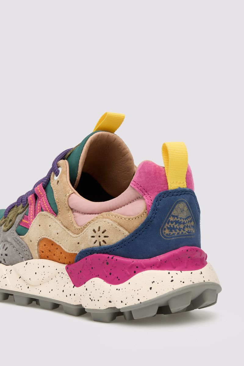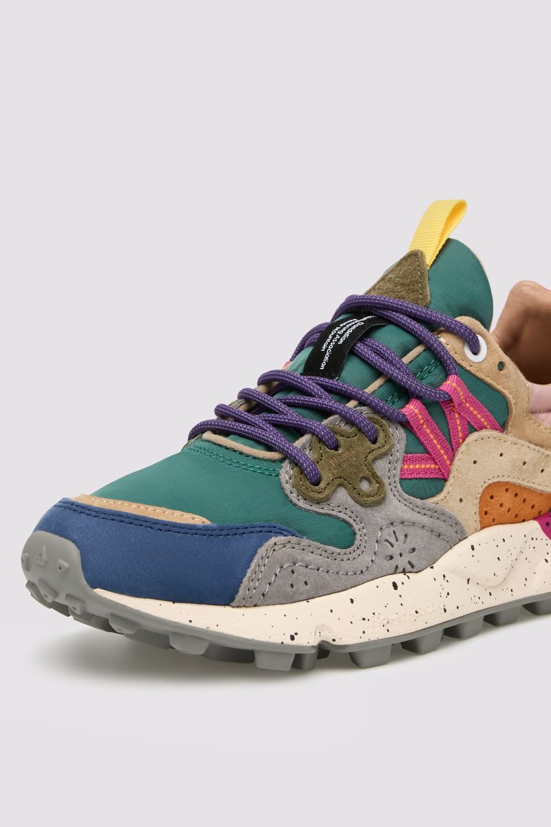 Sneaker in tessuto tecnico con inserti in suede multicolor. Occhielli rinforzati e lacci trek. Soletta interna in sughero naturale antibatterico, fondo in gomma ultra leggera con battistrada dentellato.